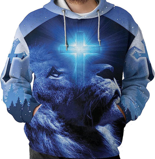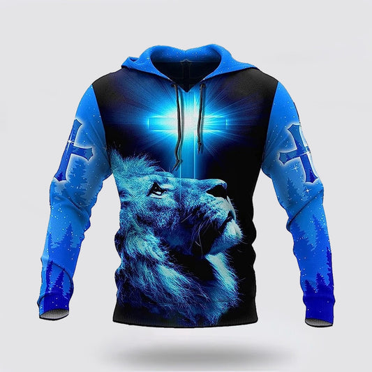 The King Lion Cross Light Blue 3d Hoodies For Women Men - Christian Apparel Hoodies