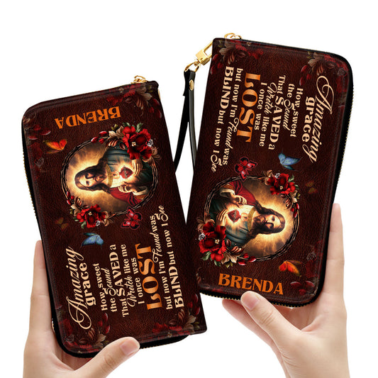 Jesus Amazing Grace Butterfly And Flowers Personalized Leather Clutch Purse - Christian Gifts For Religious Women