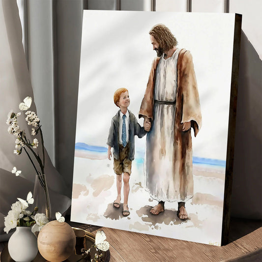 One By One Jesus Walking With Boy On Beach - Canvas Pictures - Jesus Canvas Art - Christian Wall Art