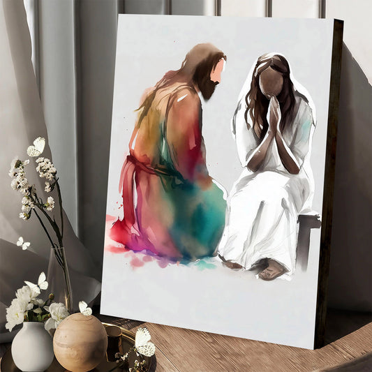 Jesus Christ Holding A Woman Watercolor Religious Art - Canvas Pictures - Jesus Canvas Art - Christian Wall Art