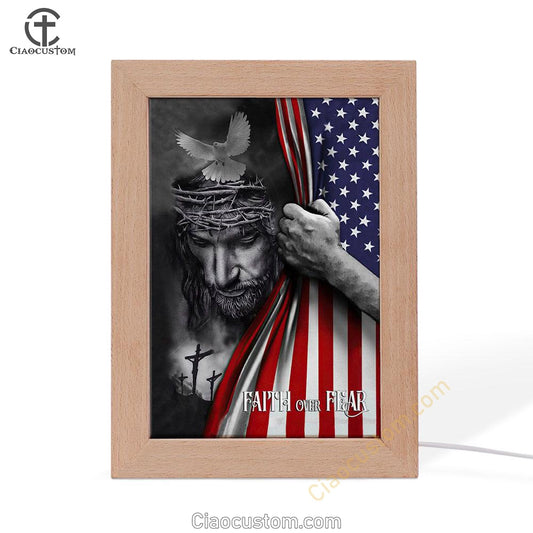 Patriotic Christian Faith Over Fear Jesus Face American Flag Frame Lamp Prints - Bible Verse Wooden Lamp - Scripture Night Light