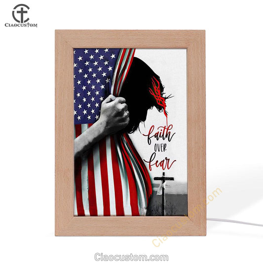 Patriotic Christian Faith Over Fear Jesus Christ American Flag Frame Lamp Prints - Bible Verse Wooden Lamp - Scripture Night Light