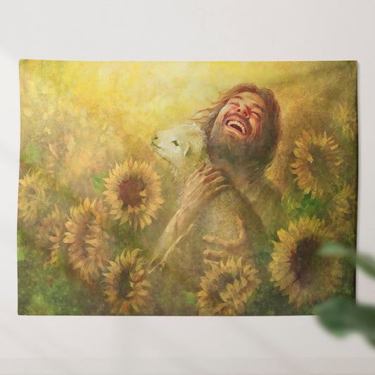 Smiling Jesus Christ Hugging Baby Lamb Tapestry - Seeds of Joy - Sunflower Wall Tapestry - Christian Tapestry - Religious Tapestry - Ciaocustom