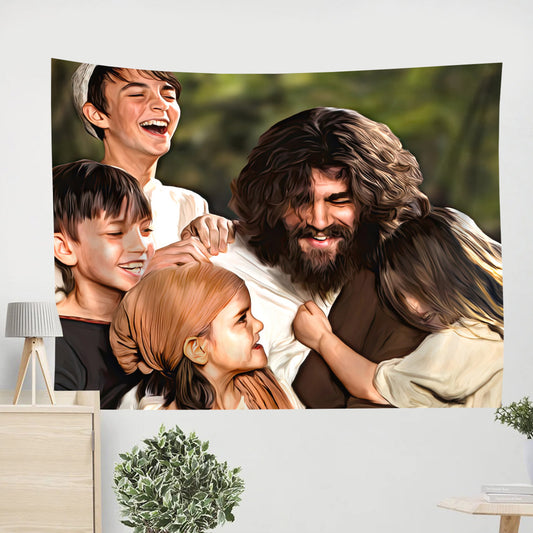Jesus Smiling With Children - Christian Wall Art - Christian Tapestry Wall Hanging - Jesus Christ Tapestry Wall Art - Ciaocustom