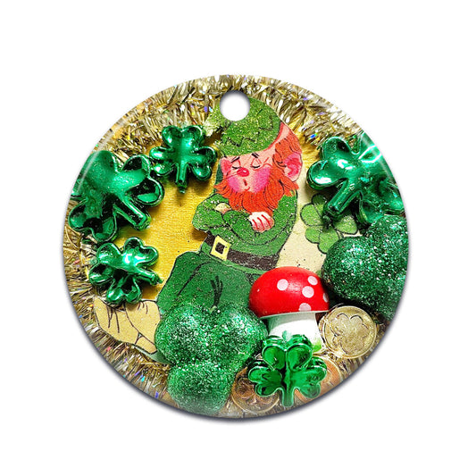St Patricks Day Gnome With Clover Love Ceramic Circle Ornament - Decorative Ornament - Christmas Ornament