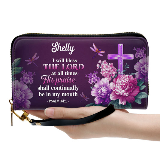 Women Clutch Purse - I Will Bless The Lord At All Times Psalm 341 Personalized Leather Clutch Purse Cross And Flower