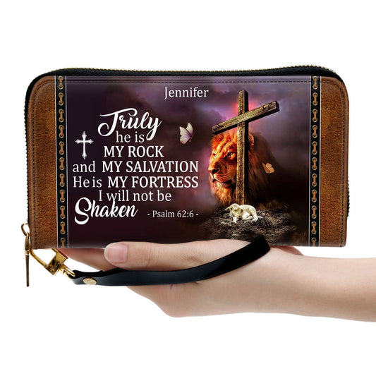 Women Clutch Purse - He Is My Fortress, I Will Not Be Shaken Psalm 626 Lion And Lamb - Personalized Zippered Leather Clutch Purse