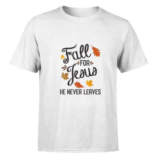 Fall For Jesus He Never Leaves Autumn Christian T-Shirt Thanksgiving Gift