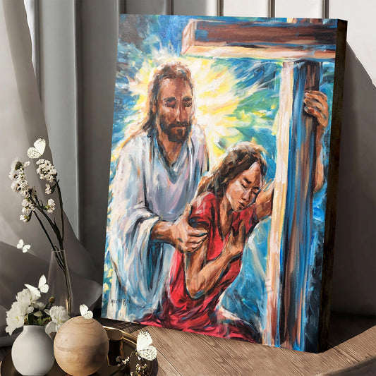 Jesus Christ With Girl At Cross Original Painting On Canvas - Jesus Canvas Pictures - Christian Wall Art