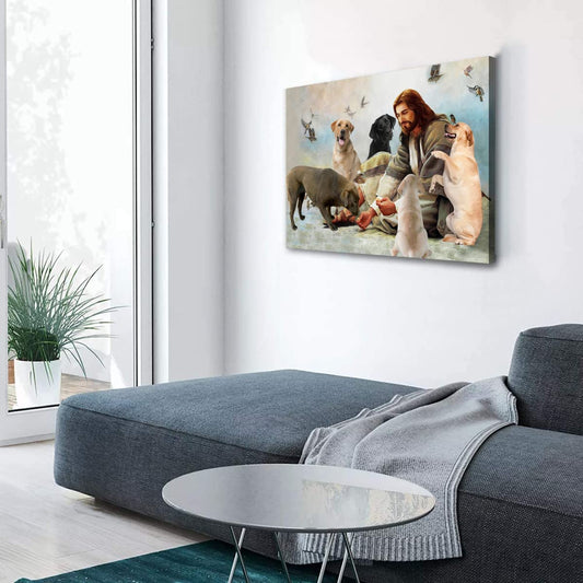 Jesus And The Labradors Canvas Wall Art - God Surrounded By Dogs Canvas - Christmas Pictures Wall Decor