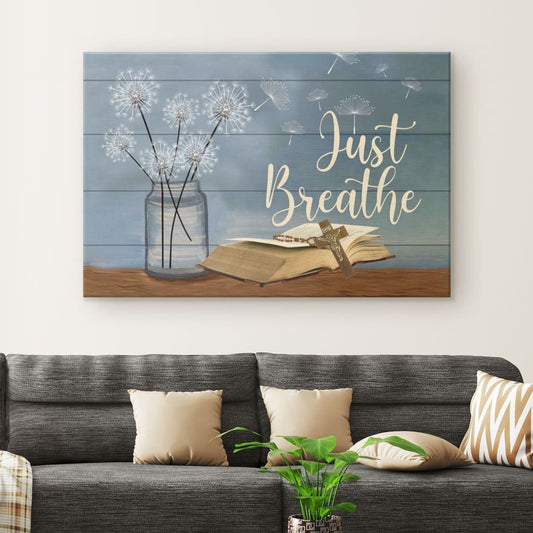 Just Breathe Flower In Vase Cross On Bible Canvas Wall Art - Christian Canvas - Faith Canvas