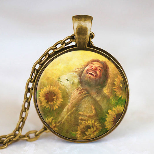 Jesus And Lamb In Field Of Sun Flowers - Jesus Christ Necklace - Religious Pendant - Catholic Necklace - Ciaocustom