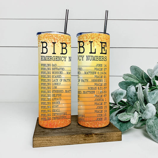 Bible Emergency Numbers - Bible Verse Tumbler - Stainless Steel - 20 oz Skinny Tumbler - Tumbler For Cold Drinks - Ciaocustom