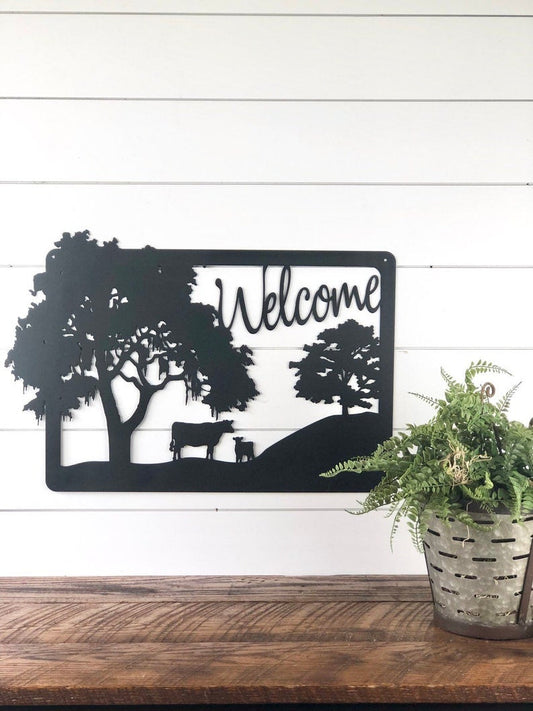 • Welcome Farmhouse Metal Sign Oak Trees And Cows Cow Calf Pair Sign Ranch Sign Metal Farm Home Decor Sign Farm Life Metal Sign