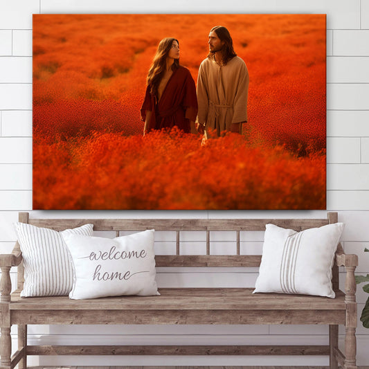 Jesus And His Wife On A Red Field - Canvas Picture - Jesus Christ Canvas - Christian Wall Art