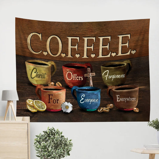 Coffee Christ Offers Forgiveness For Everyone Everywhere Tapestry - Christian Tapestries - Wall Tapestry Bible Verse
