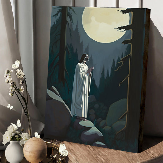 Jesus Standing Atop A Hill Admiring The Full Moon Shining Bright In The Night Sky - Jesus Canvas Pictures - Christian Wall Art