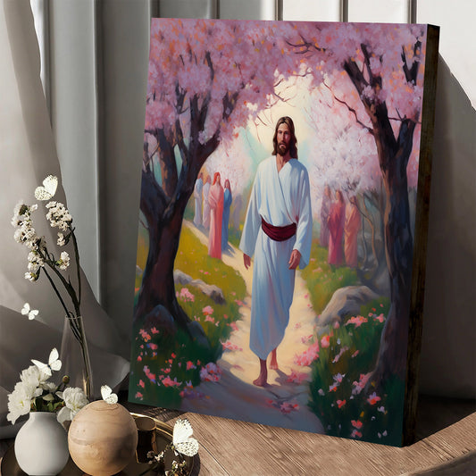 Jesus Walking On A Spring Path, With Cherry Blossoms - Jesus Canvas Pictures - Christian Wall Art