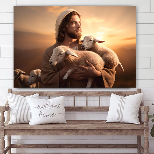 Jesus Is Holding A Sheaf Of Sheep While The Sun Is Setting - Canvas Picture - Jesus Christ Canvas - Christian Wall Art