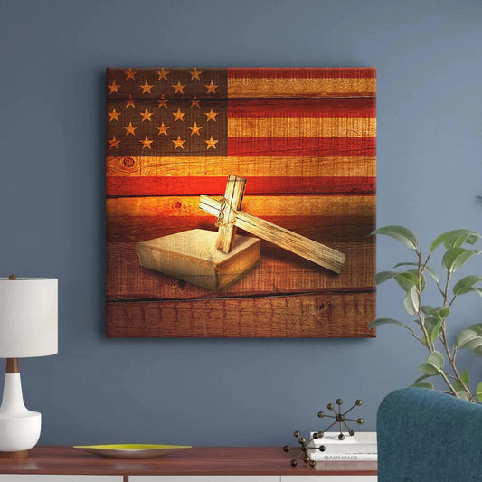 American Flag Wall Art Cross On Bible Christian Canvas Print - Christian Wall Art