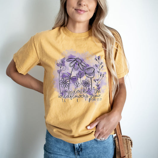 Consider How The Wildflowers Grow Spiral Luke 12:27 Tee Shirts For Women - Christian Shirts for Women - Religious Tee Shirts