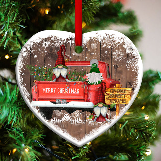 Gnome Red Truck Christmas Heart Ceramic Ornament - Christmas Ornament - Christmas Gift
