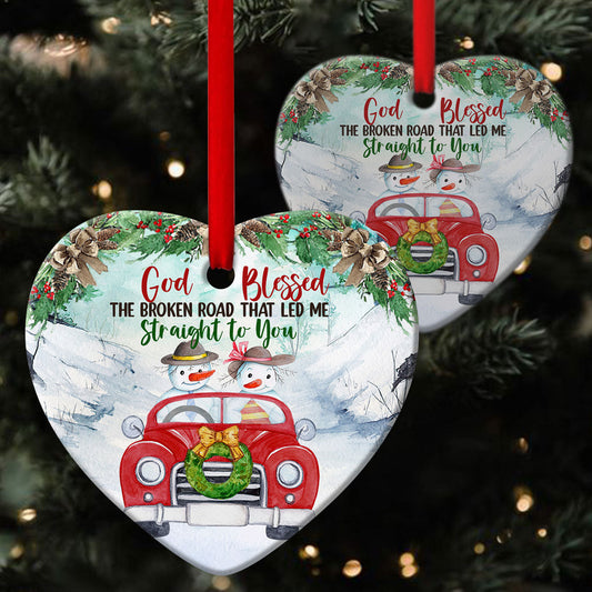 God Blessed The Broken Road - Cute Snowman Ceramic Heart Ornament- Christian Hanging Gift