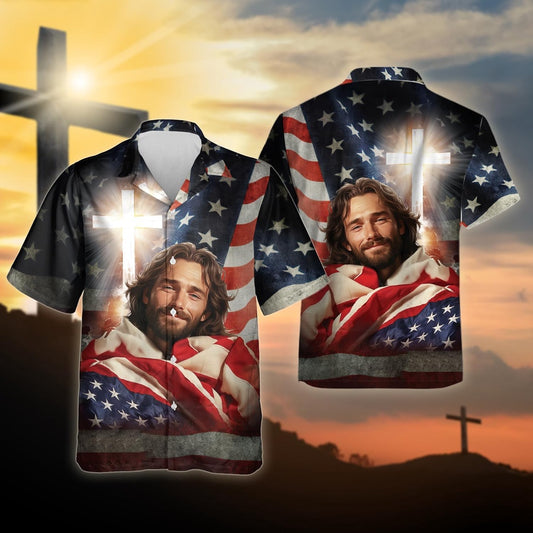 Jesus Smile With America Flag Christian Hawaiian Shirt - Hawaiian Beach Shirts for Men Women
