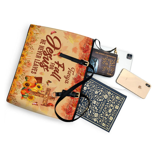 Autumn Season Bag Fall For Jesus He Never Leaves Personalized Large Leather Tote Bag - Christian Gifts For Women