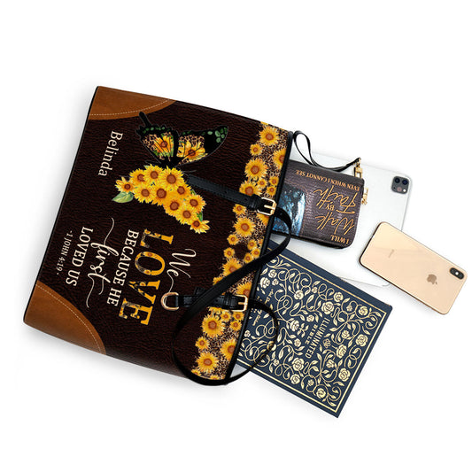 We Love Because He First Loved Us Personalized Large Pu Leather Tote Bag For Women - Mom Gifts For Mothers Day