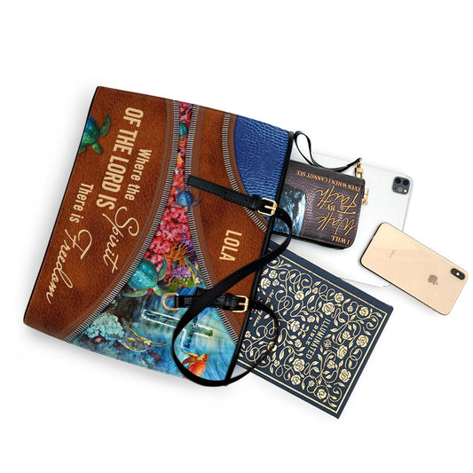 Where The Spirit Of The Lord Is There Is Freedom Personalized Cross Large Pu Leather Tote Bag For Women - Mom Gifts For Mothers Day