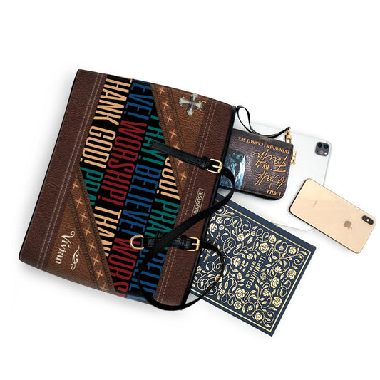 Pray Believe Worship Beautiful Personalized Large Pu Leather Tote Bag For Women - Mom Gifts For Mothers Day