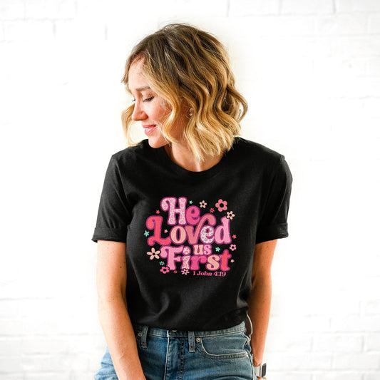 Retro Leopard He Loved Us First Tee Shirts For Women - Christian Shirts for Women - Religious Tee Shirts