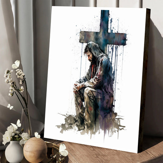 Jesus Praying Before the Cross in Watercolor - Jesus Canvas Art - Christian Wall Canvas