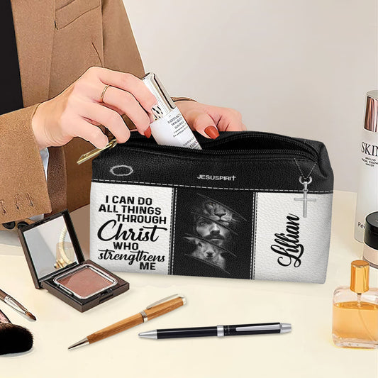 Personalized Zippered Leather Pouch Jesus & Lion Philippians 413 - Inspirational Gift For Christian Family