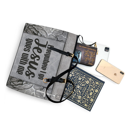 Everywhere I Go Jesus Goes With Me Large Leather Tote Bag - Christ Gifts For Religious Women - Best Mother's Day Gifts