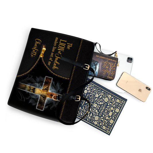 Personalized Large Leather Tote Bag The Lion Of Judah Makes Lion Out Of Me - Spiritual Gifts For Christian Women