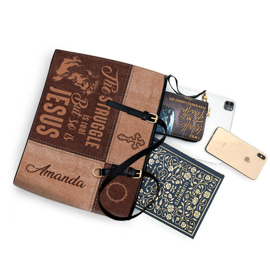 Personalized Large Leather Tote Bag The Struggle Is Real But So Is Jesus - Spiritual Gifts For Christian Women