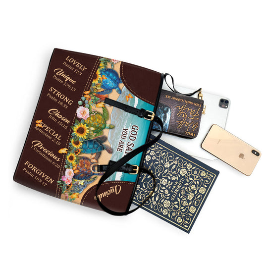 Personalized Turtle Large Leather Tote Bag God Says You Are Special - Religious Gifts For Women Of God