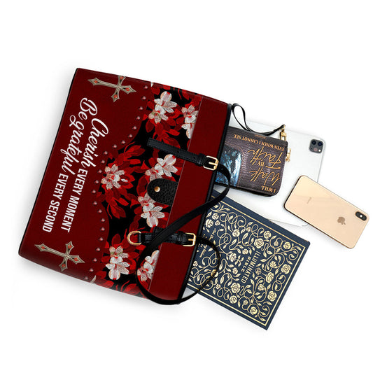 Cherish Every Moment Be Grateful Every Second Large Leather Tote Bag - Christ Gifts For Religious Women - Best Mother's Day Gifts