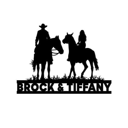 Personalized Couple Horses Cowgirl Cowboy Metal Sign - Western Horseshoe Couple - Riders Mr & Mrs Monogram - Metal Wall Art Decor
