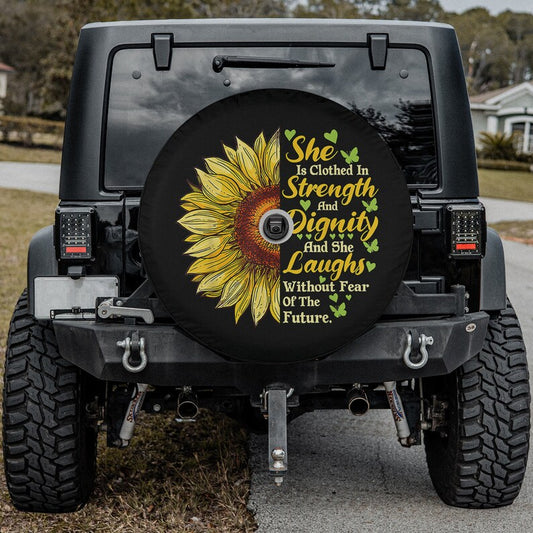 • She Is Clothed Strength Dignity Laughs Bible Verse Sunflower Spare Tire Cover - Bible Verse Tire Cover