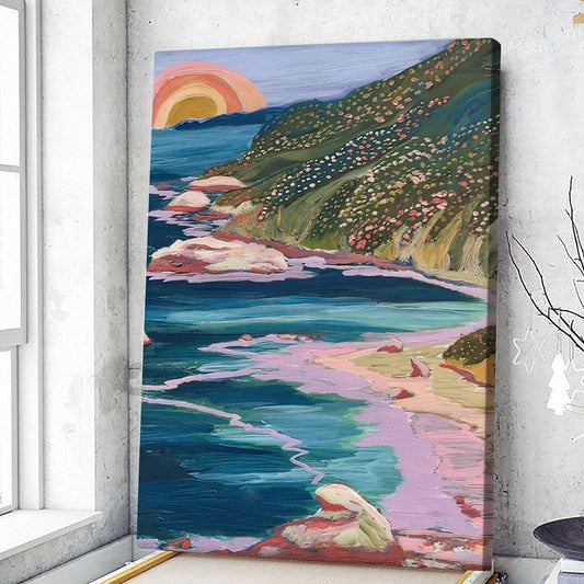 Big Sur California Wrapped Canvas, Colorful Travel Poster, San Francisco Beach Coastal Decor, Pacific Highway Landscape, Poppies Rainbow Ocean