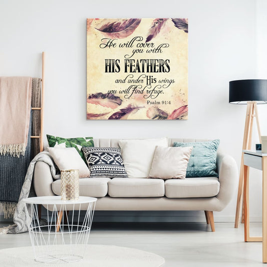 Psalm 914 Niv He Will Cover You With His Feathers Canvas Wall Art - Bible Verse Wall Art - Christian Decor