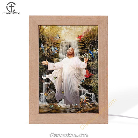 Jesus, Colorful Birds, Forest Stream, Scenery Painting Frame Lamp