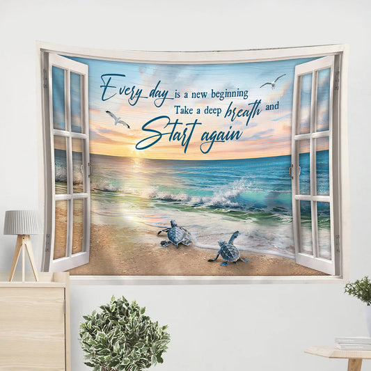 Every Day Is A New Beginning Beach Painting Sea Turtles Tapestry - Bible Verse Tapestry