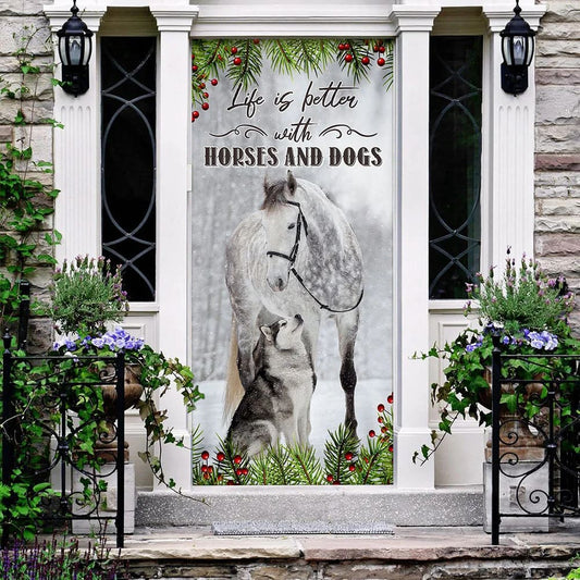 Life Is Better With Horses And Dogs Door Cover - Christmas Door Cover - Christmas Horse Decor - Christmas Outdoor Decoration