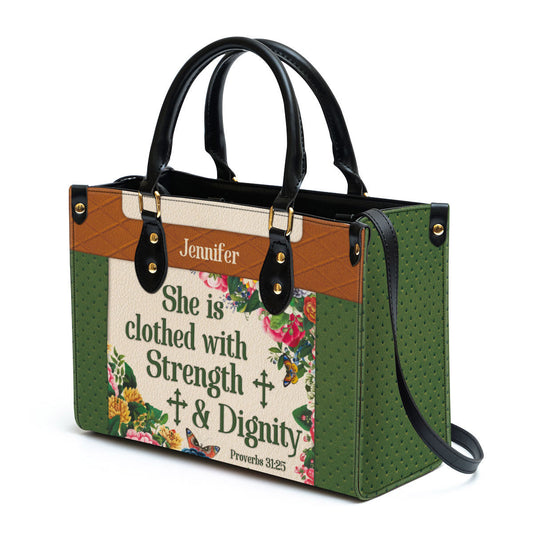 She Is Clothed With Strength And Dignity Leather Bag - Custom Name Flower Leather Handbag - Christian Gifts For Women